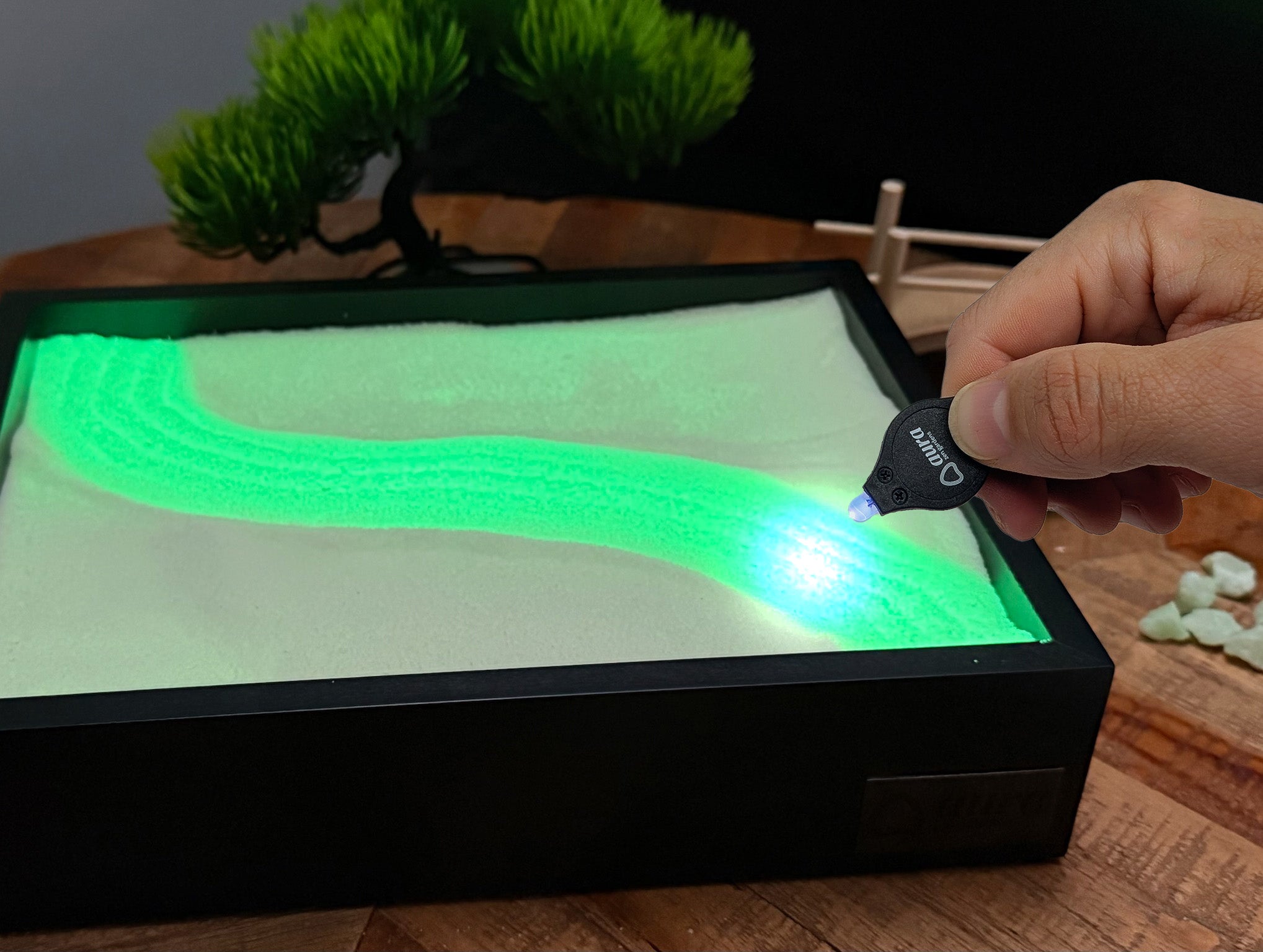 Each Aura Zen Garden comes with a discreet built-in UV light. Simply switch it on to instantly energize the sand and enjoy a vibrant glow—even in the middle of the day.